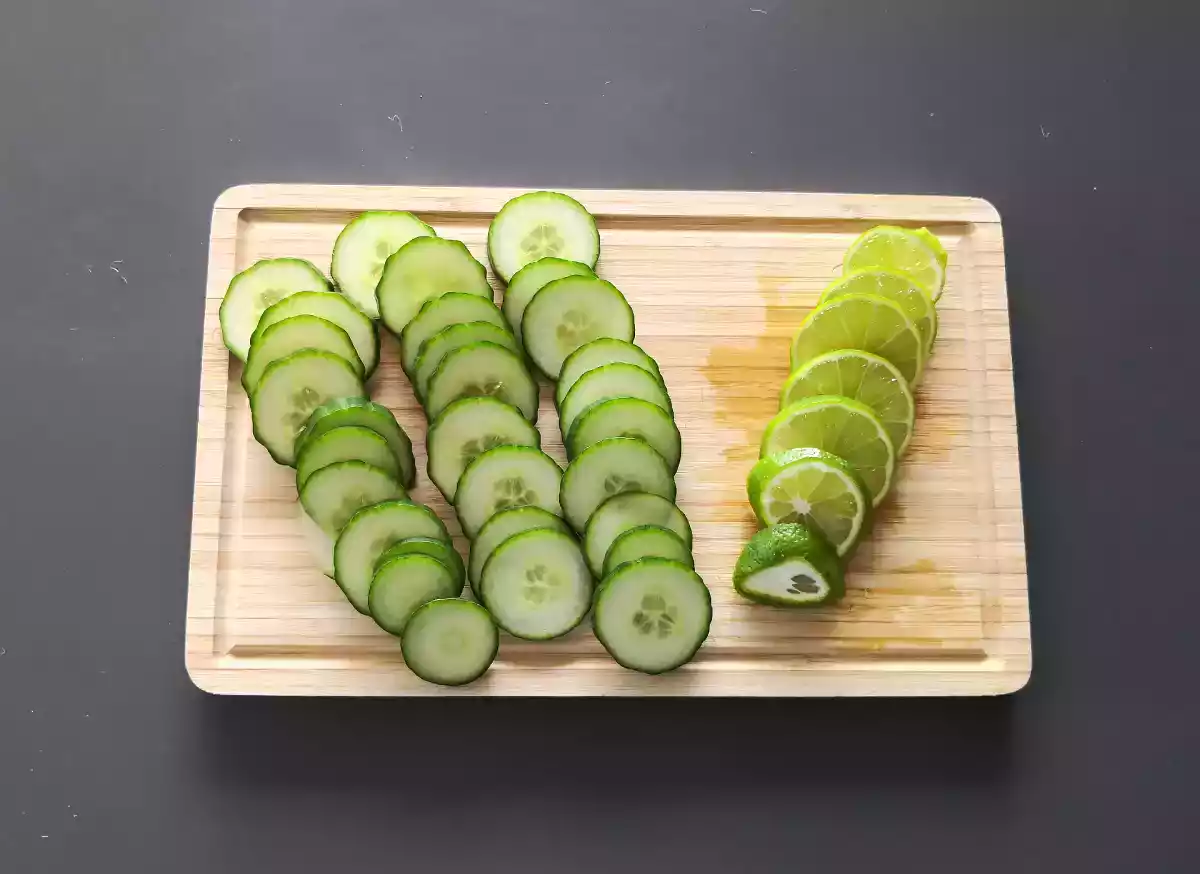 Wash the cucumber and lemon. Cut them into slices.