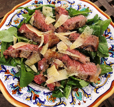 I grilled all the meats, other than the steak, over a moderate fire until golden brown on both sides and set them all on a large platter. The steak was grilled over very high flame to seal the outside while leaving the inside quite rare, although not quite as rare as I usually like it, since some of my guests were not hard-core carnivores like myself! Sliced thin on the bias and laid on a bed of arugula leaves, seaonsed with salt and freshly ground black pepper, topped with shards of parmesan, and drizzled with olive oil, the steak is called a tagliata di manzo. Except for a big 'cowboy ribeye', this is my favorite way to eat a steak.