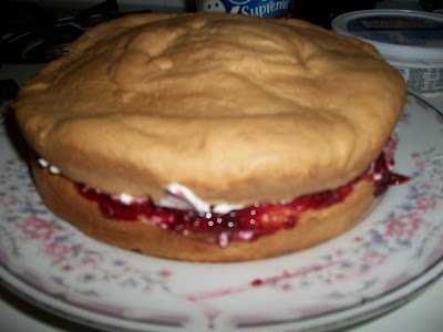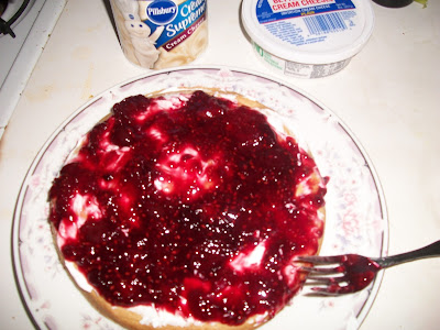 She smeared some Tofutti cream cheese on the first layer, covered that with some cherry preserves crap...