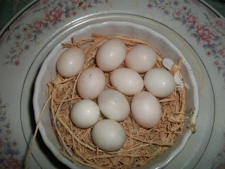 Two eggs were ripped from their box of siblings and re-nested in a green and white ceramic bowl.