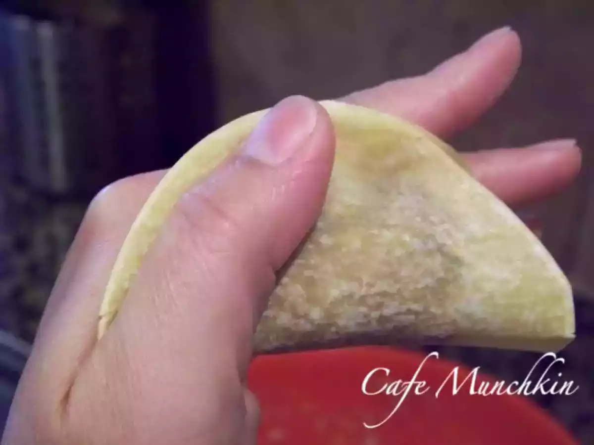 - Moisten the edges of the wrapper, fold in half then press the top part to seal.