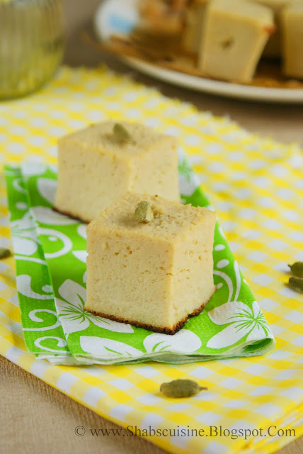 The cake is more like a pudding, soft, moist, fluffy, but not spongy like our normal cakes. It can be eaten warm or at room temperature. This cake does not keep well and should be eaten within a day or two and is normally served along with evening tea. It is very important to set the heat to minimum as the cake gets burnt quickly. You can see that in few of my pictures that the cake is over browned as my son was impatient and hungry so had to turn up the heat a bit and the cake browned much further than it should!The recipe is very simple and very flexible. You can reduce or increase the amount of sugar, flour, eggs and milk powder in the recipe and yet get the same result. I have been making this quite a few times now and always used different measurements and yet you get a good cake.