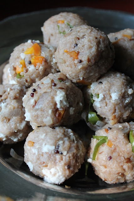 Heat a steamer pot or idli cooker. Place the balls on greased idli plates and steam for 8 to 10 mins.