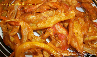 click image for enlarged view Wash and wipe the vegetables using tissue paper and strip them to thin slices and keep aside.Take a mixing bowl, add all the flours,chilli powder,salt,pepper powder and mix well.And add the soy sauce and ginger garlic paste and mix well and add the striped vegetables,sprinkle little water and mix everything well to a thick dough(but not too dry like pakoda dough) with little moisture.Heat oil in wok/Pan, when its really hot take small piece of dough and drop carefully in to the oil (fry in medium hot to ensure proper cooking n crispness).Fry on both sides till turn golden brown and crisp and remoce from the oil and drain it in a paper towel.Sprinkle some pepper powder over the hot fried pakoras (optional).Crispy vegetable pakoras are now ready to serve with ketchup.Njoy!!!