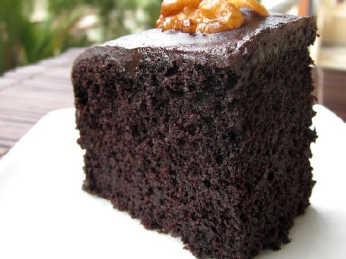 - Melt the chocolate with water in a double boiler, keep stirring. Once the chocolate has melted, add in the oil and turn off heat. Pour over the cooled cake and decorate as desired.