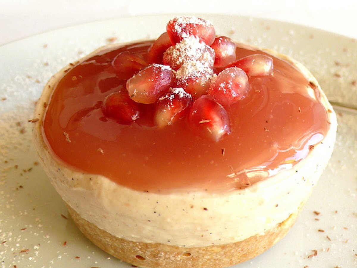 Cacao and ginger mini cheesecakes with pomegranate sauce