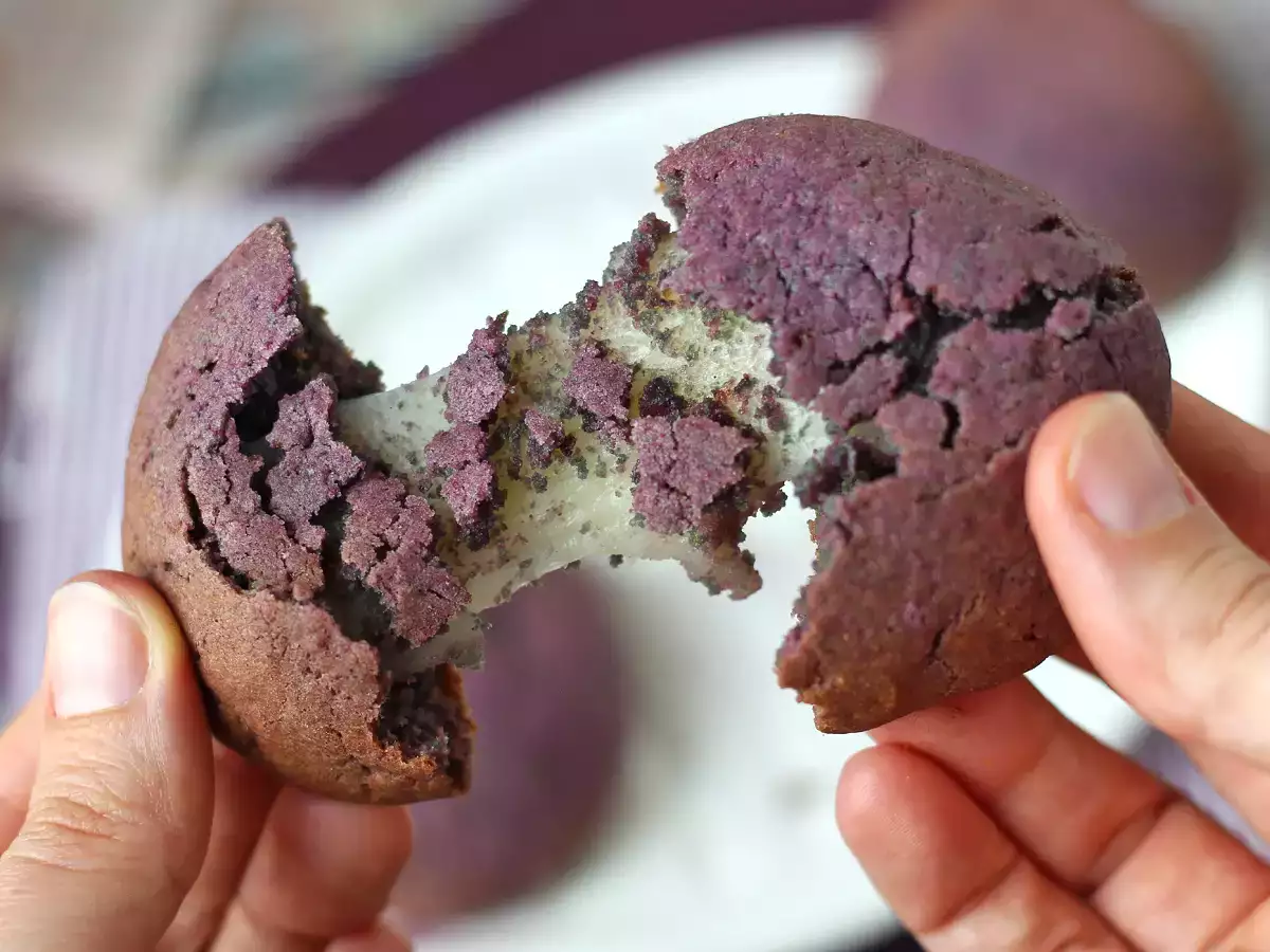 These mochi cookies with ube are the perfect blend of two textures we love: the soft cookie on the outside and the elastic, melting mochi center on the inside. When baked, the cookie remains soft, while the center becomes slightly chewy, almost addictive. The ube, with its pretty purple color and sweet, slightly vanilla taste, adds an original touch that makes a change from classic cookies. And if you add white chocolate chips, the contrast becomes even more delicious ;)