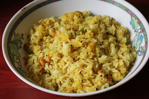 Now add in the cooked rice and mix well. Fry the rice in the masala till it heats through.