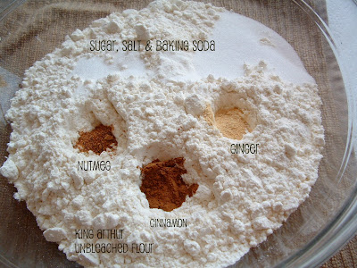 First, we measure our dry ingredients. NOTE:I forgotleft out the allspice. I used it up making my famous Red Cabbage, last week. Full disclosure:I amnotan employee of King Arthur Flour, nor do they pay me or provide free products. I am a regular customer, though. I simply love their baking products because of the quality of their ingredients. You don't have to add crystallized ginger (I found this in the bulk section at Whole Foods) ...