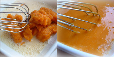 I don't think it matters what order you do things, but I whisked the eggs and then combined the pumpkin puree. I put that in the refrigerator, to keep with the cold theme.