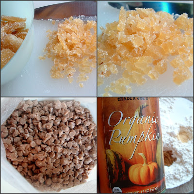 I decided to use 1/2 cup of minced crystallized ginger and 1/2 cup of mini cinnamon chips-- half of what the original recipe calls for. You need 2/3 cup of pumpkin puree. Puree freezes really well, in case you don't use the rest for something else in a day or two. You need two eggs. Cold eggs. More on that, in a moment. Now, we need butter. Not margarine, please. Butter. One stick. Cold butter. Do you see a theme here?