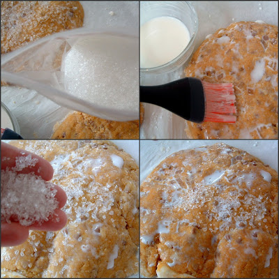 30 minutes later, the baking sheet and the unbaked scones are ice cold. I brushed each round with milk and a sprinkling of coarse bright sugar.
