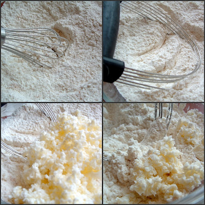 So, now all the ingredients are prepped and ready to make scones. This shouldn't take more than 15 minutes. When you're photographing step-by-step, it takes more than twice that time. But, you readers are worth it. Stir/whisk the dry ingredients. A pastry cutter helps. (The warmth of your fingers might warm the butter up.)