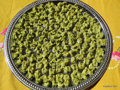 Moong dal is very tasty, nutritious and easy to digest. It is very rich in protein and if moong dal with its green cover / whole moong dal is used then its nutritional value increases many folds as the minerals and vitamins remain intact with the cover. Whole moong dal is sprouted and the sprouts are extremely healthy, and apart from protein and minerals it becomes very rich in Vitamin C. Mungodi is one of the many ways moong dal can be included I the diet. Mungodi is made to vegetable exactly like Badi / Vadi / Bari. Mungodi is a wonderful variation of moong dal savory and can be had with roti / parantha / rice. Mungodi fried or roasted with 2-3 drops of oil (Microwave) is a wonderful appetizer. My husband loves all form of Mungodi, thus I always stock it by making Mungodi at home.