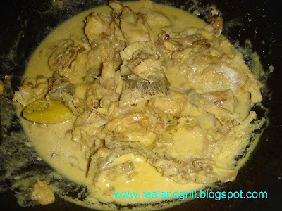 While slowly stirring in the middle, slowly pour the coconut milk to avoid curdling and attain a creamy consistency. Continue simmering on low heat until the sauce has thickened and liquid is again reduced and somewhat oily. There it is!