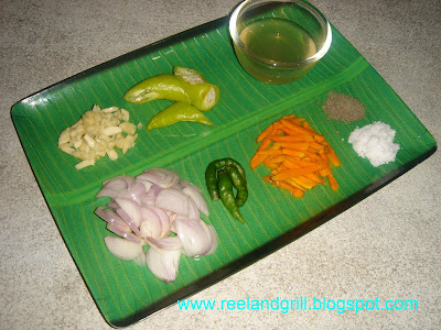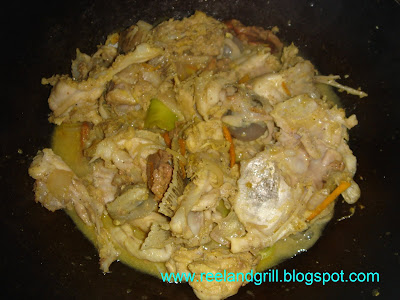 To complement the fish meat, here are the other ingredients we need: 2 tbsp vegetable oil, 6 gloves garlic, peeled, crushed and roughly chopped, 3 small pcs of turmeric, peeled and julienned to make about 2 tablespoon, 1 medium onion, peeled and chopped, ½ tsp ground pepper, 2 tsp salt or to taste, 6 tbsp natural vinegar, 1 medium green pepper, cut into three pieces, 3 small finger chilies and 1 bayleaf or ?laurel? which I totally forgot. :-)