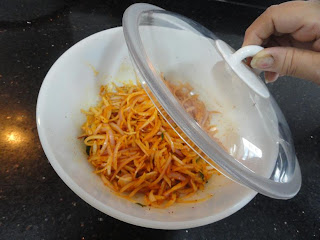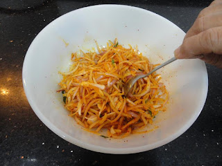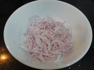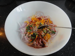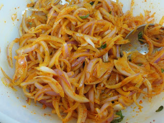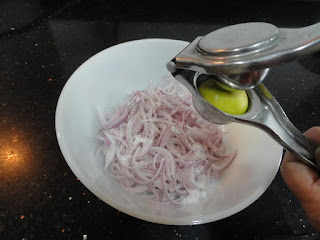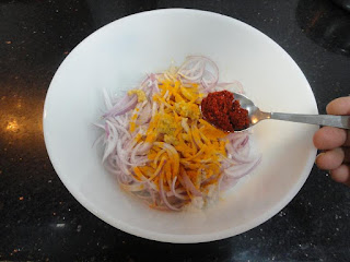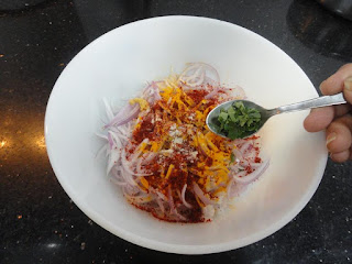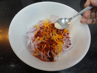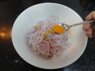 Chop the Onions in julienne form. Marinate the Onions by adding Salt, Lemon juice, Ginger paste, Turmeric powder, Red chili powder, Asafoetida and chopped Curry leaves. Set it aside for approximately 25-30 minutes. During the marination period, the onion releases moisture.