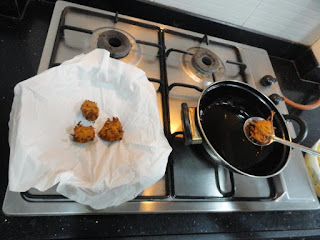 Now add chopped Coriander leaves, Rice flour and Gram flour (Besan) and mix gently. Ensure that the water contents released are absorbed by the flour. Now heat the oil in a frying pan. Add a teaspoon of hot Oil in the Fritter mixture. Check and adjust the seasoning. Drop small lemon sized balls of the batter into the hot oil. Fry till it is golden brown in colour on medium flame. Drain the excess oil on absorbent paper.