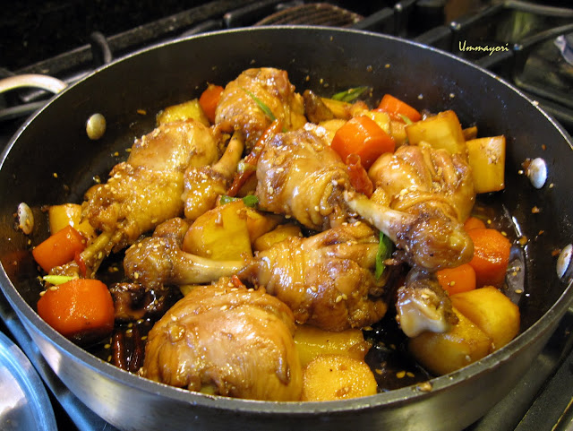 6 chicken legs, bone in and skin on1/2 cup soy sauce1/4 cup Mirin (cooking rice wine)1 cup low sodium chicken broth1 Tbsp sugar, or more to taste1 Tbsp sesame seed oila pinch of black pepper4 dried Thai red chili4 garlic cloves, minced1 tsp minced ginger2 parsnips, peeled and cut into medium cubes (approx. 1? x 1?)2 carrots,cubed similarly to the parsnip.handful of mushrooms, halved or quartereda few stalks of green onion, chopped into 1/2 inch Directions: