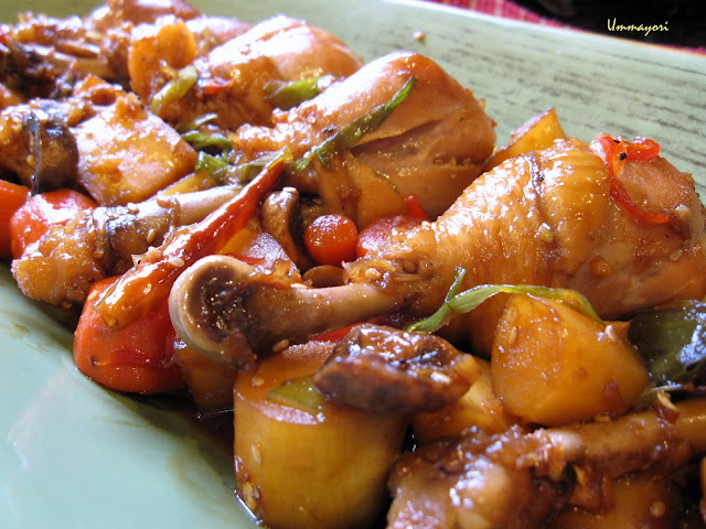 Rinse the chicken legs, cut around the bone and pull the meat down, looking like chicken blow pops, with a clean bone sticking out of a clump of tender chicken meat.Put it in the cold water and boil about 5-7 minutes. Remove from the heat and drain,In a large saute pan, mix together sugar, soy sauce, mirin, ginger, garlic and dried red chili. Mix well. Add chicken and mix until all chicken pieces are coated. Add vegetables and mix well.Heat a large pan over medium high heat. cooking until the marinade is fragrant, about 5 minutes. Pour 1/2 a cup of broth over chicken and cover, reducing heat. Check chicken after 15 minutes to make sure there is enough water, and add 1/4 cup of necessary. You do NOT want to add too much liquid because the vegetables and the chicken all release juices and a too watery base is not ideal. Cook for 25 minutes total, stirring occasionally and checking to make sure there is enough liquid and just adding a little bit at a time. Once chicken is fully cooked and vegetables are tender, add scallion pieces and toss. Sprinkle with sesame seeds as a garnish. Serve hot with fresh rice.