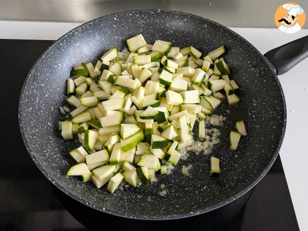 Finely chop the onion and brown it in a pan with a drizzle of olive oil. Add the zucchini, previously washed and cut into evenly sized pieces, and cook for about 12 minutes (stirring often).