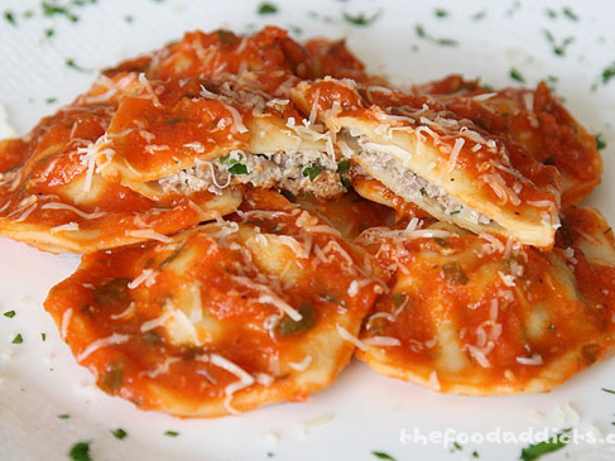 You can use a 2-inch hexagon cutter to form the ravioli shape. But use whatever you have on hand - circles will do. To season the duck filling, add half-and-half, parsley, basil, grated parmesan cheese, garlic powder, and salt and pepper to taste. Scoop about a tablespoon of duck into the middle of the pasta and place another piece on top and seal it by brushing the edges with a beaten egg. Press it together with your fingers.
