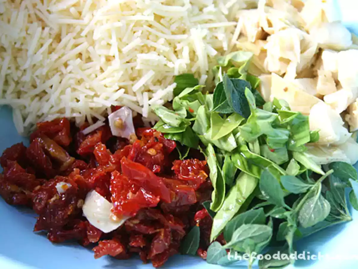 - For the filling, we combined a few of our favorite ingredients: parmesan cheese, sun-dried tomatoes, marinated artichoke hearts, and fresh basil and oregano from the garden. Just chop and dice them to smaller pieces.