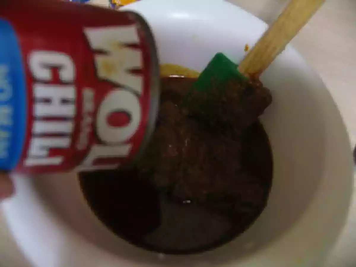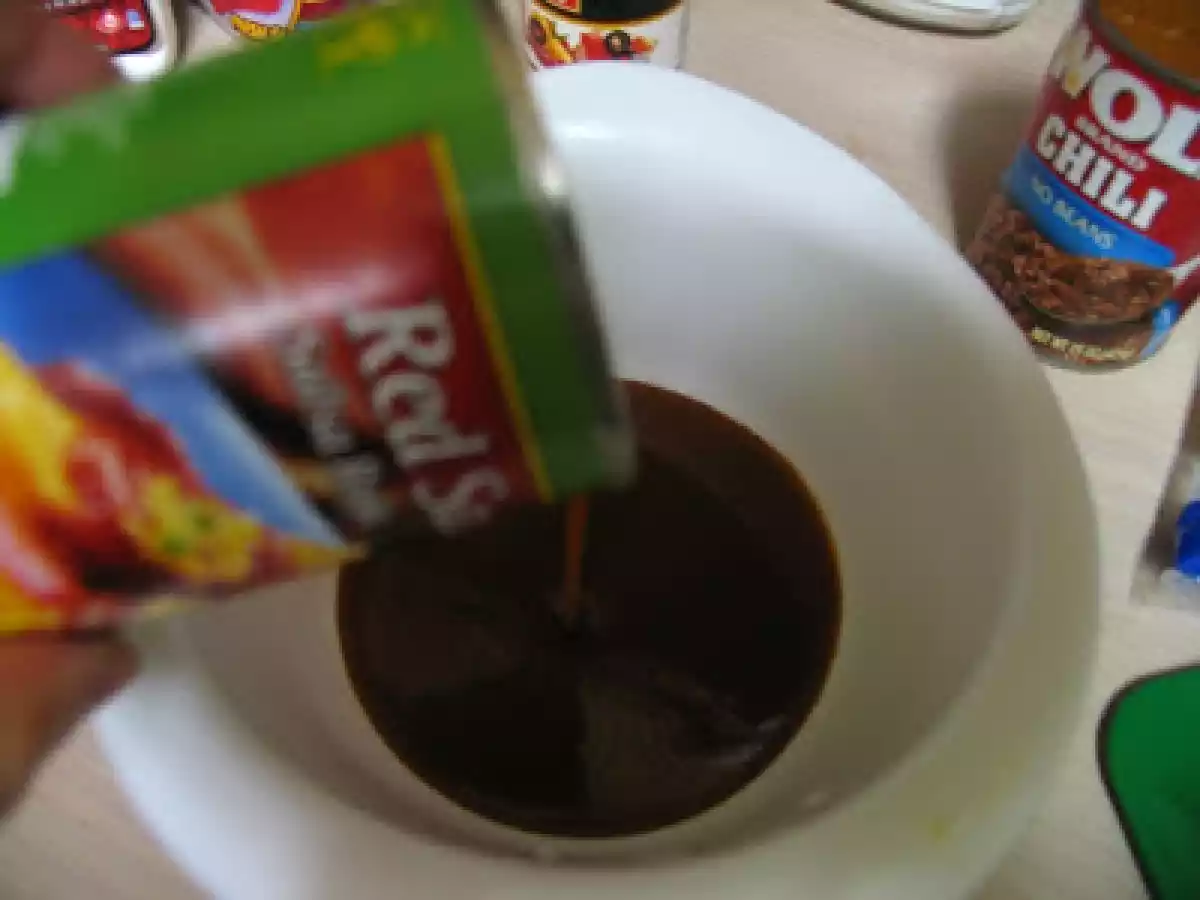 - In a separate bowl mix enchilada red sauce and the wolf brand chili together, blending well.