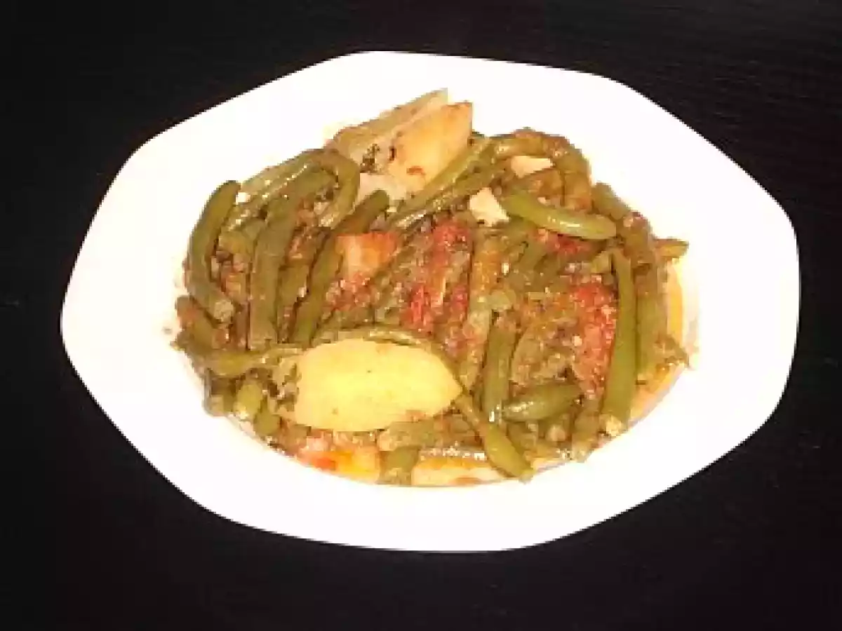 - Add the chopped garlic and fry for another minute. Add the green beans and potatoes and stir for another minute.