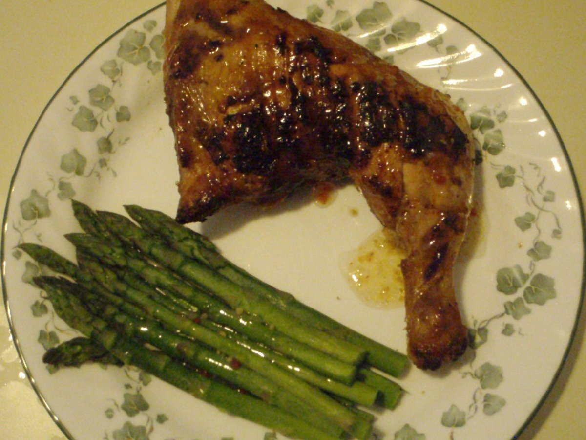 Grilled chicken leg quarters served with asparagus with Italian dressing.
