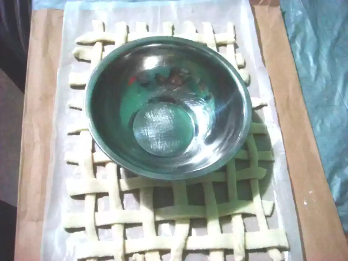 Lightly grease the top of the 7 inch diameter metal bowl (use butter or cooking spray). Now transfer the paper with the latticed dough into the metal bowl. Trim any excess dough.