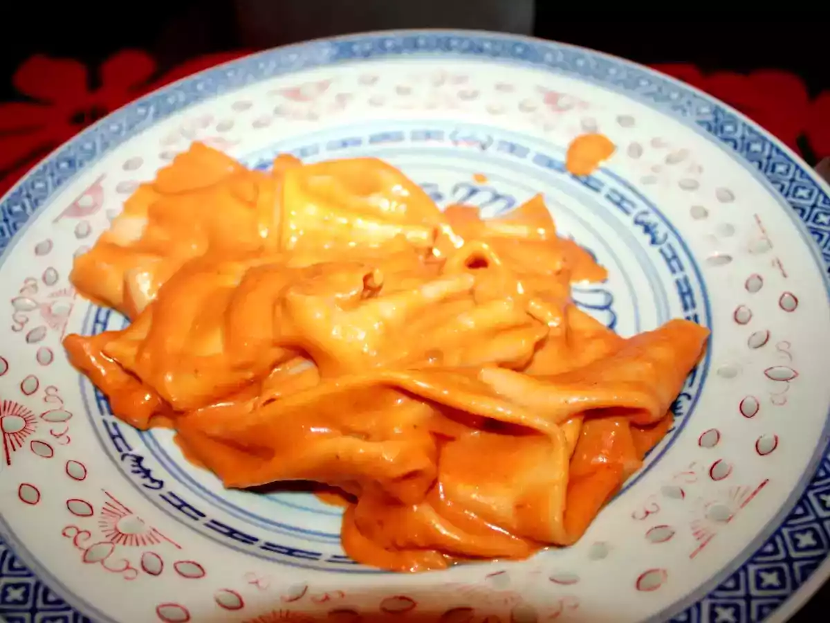 - Heat the oil and add the chopped garlic, then add the tomato sauce, season, heat up and add the vodka and at the end the cream. Mix well.