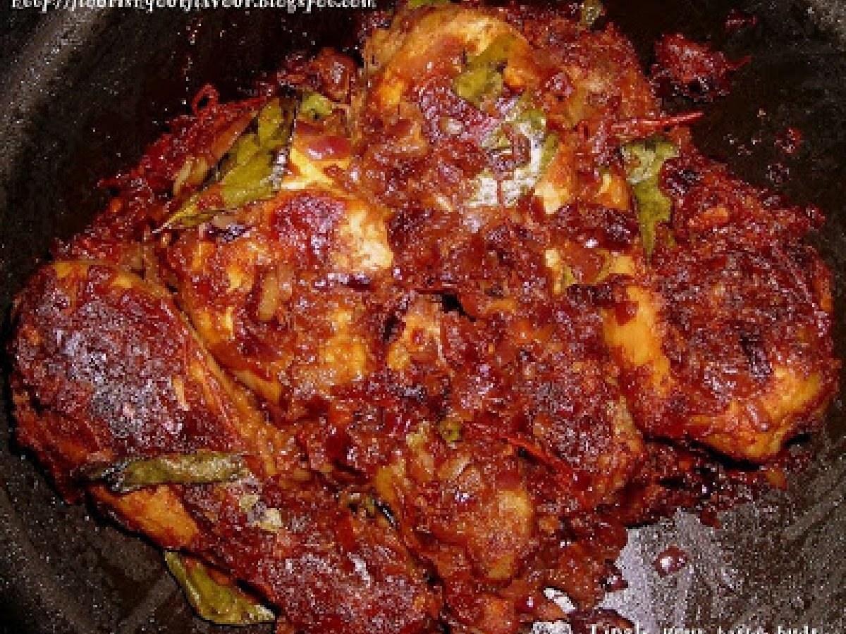 - Now add the tomato sauce, curry leaves and cook until you get a thick gravy. Add the fried chicken and mix well, cook till all the masala is coated well with the chicken.
