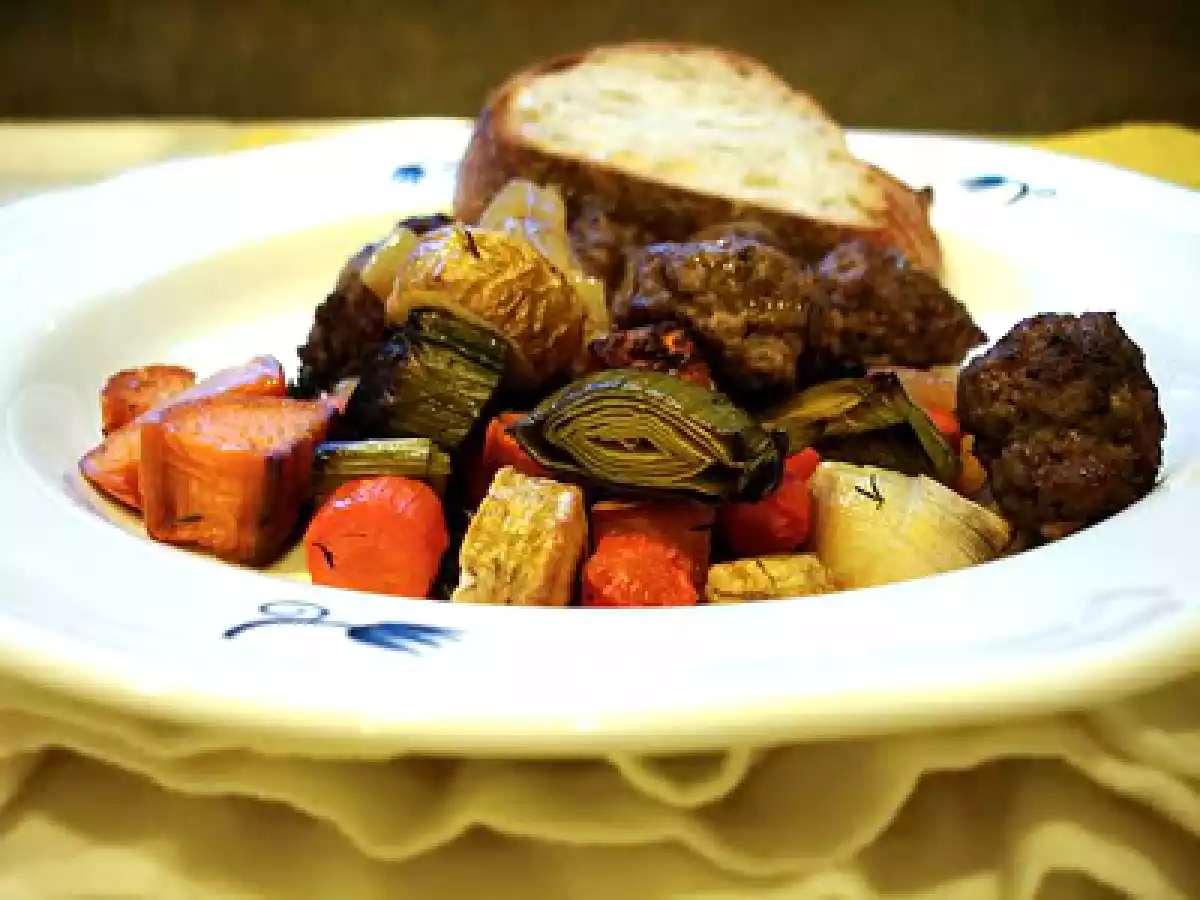 - Add the caramelized onions to the meatballs and bake in the oven at 375°F until the meatballs are cooked through, about 20 minutes. Serve the meatballs with the caramelized onions and roasted vegetables. This meal will go well with some fresh bread or mashed potatoes.