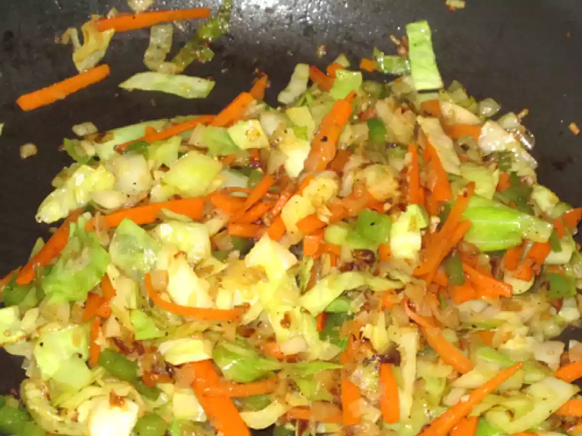 In a large pan over high heat, add 2 tbsp oil, garlic and onions, and cook for 2 minutes. Add the rest of the vegetables and cook until they are almost soft (about 8 minutes).