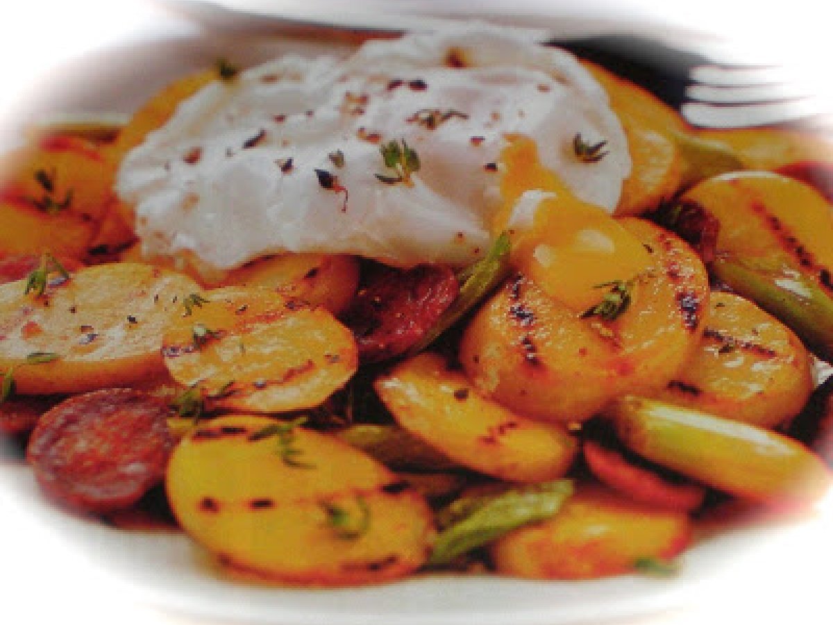- In a separate frying pan , cook the bacon or chorizo sausage and spring onions for 3 minutes then stir in the potatoes. Meanwhile poach the eggs in boiling water.