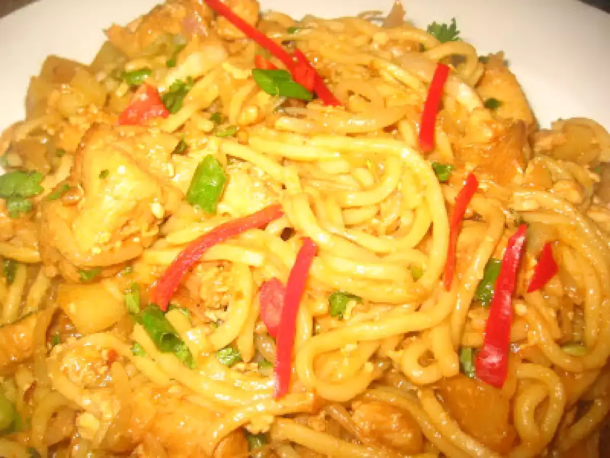 - Scramble the eggs and mix in with the noodles. Serve hot and garnish with chopped spring onions,coriander leaves and sliced red chilies. Squeeze some lime juice over the noodles before eating.