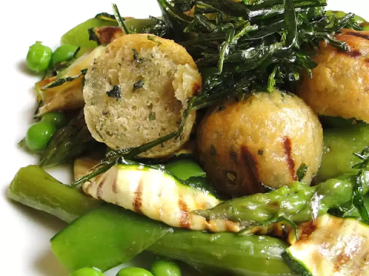 - Just before serving add the reheated koftas and combine until they are coated in the dressing. Arrange the vegetable medley on individual plates or a platter and top with the crispy tarragon leaves.