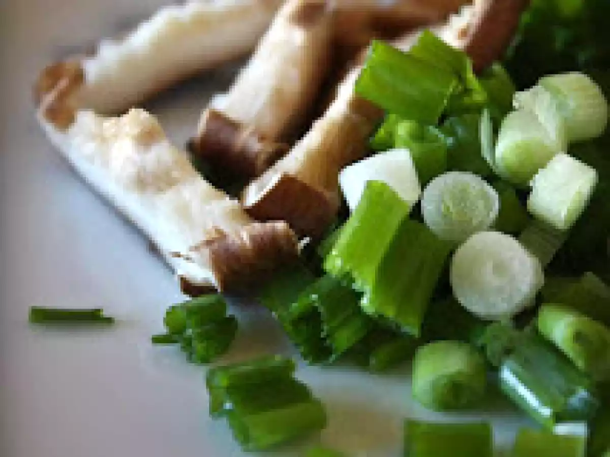 - Add sriracha to taste as well, (keep in mind it's pretty spicy). Divide the sliced green onions and shitake mushrooms into four equal parts and place them in each bowl, then place 5 cooked shrimp in each bowl as well.