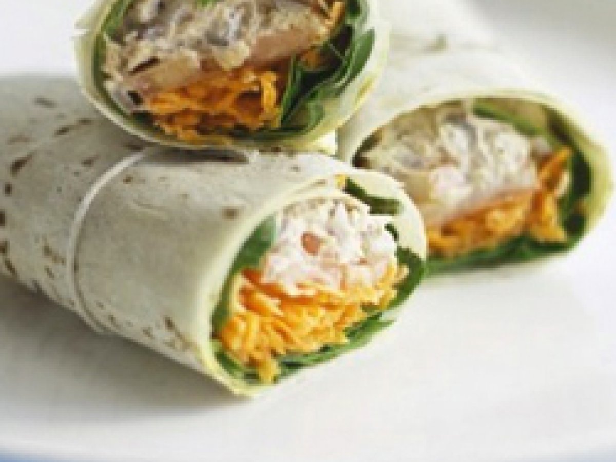 - Put a handful of spinach leaves, some carrot and several slices of tomato in the centre of each wrap.