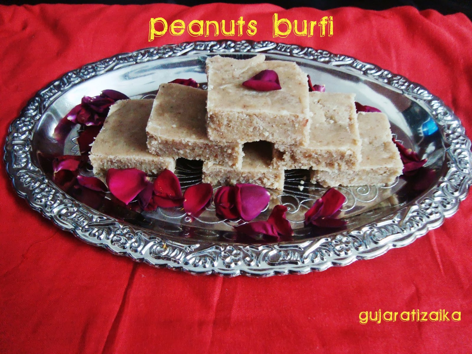 Blend the peanuts in blender like a fine powder. Dissolve the sugar with ¼ cup of water and bring it to a boil while stirring continuously. Boil the syrup again until it is of 1 string consistency. Add peanut powder, ghee and cardamom powder . Remove from the fire while stirring continuously. Spread the mixture on a thali (flat metal plate) and allow to cool. Cut into desired shape.