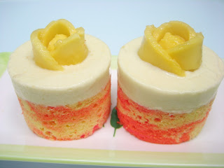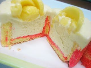 Make a >Basic Sponge Cake Recipe<, then dividethe batter into the amount of different colors you want in your cake then add food coloring in the respective batters. So in my case, three - pink, orange and yellow; note that I have more yellow than pink and orange because I wanted yellow to be the dominant color in the marbled sponge.