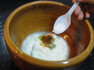 Take curds in a mixing bowl. Add Ginger paste, chopped Green chillies or Green Chilli paste, Cumin powder, Salt and mix. Add a glass of chilled water and blend it well.