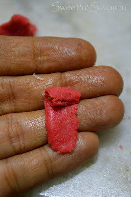 Take a little portion of the red coloured chenna and pat it to a rough rectangle with a longer side than width.
