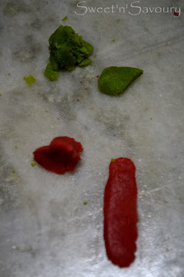 Divide the remaining portion of chenna into two and add green and red food colouring to each.