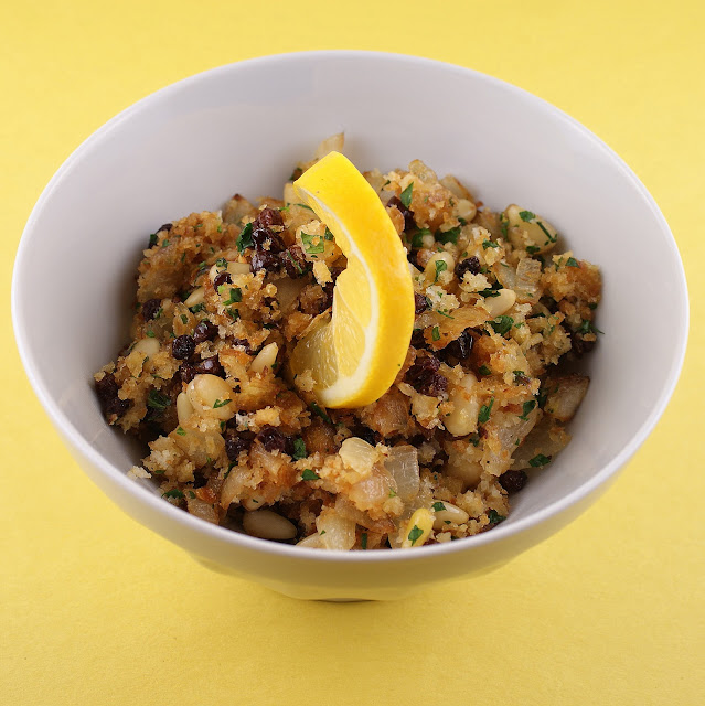 Heat 4 tablespoons olive oil in a medium saute pan, cook the onions until limp and slightly colored. Stir in the bread crumbs, anchovy and preserved lemon rind, if using,currants, pine nuts, parsley and half of the lemon and orange juice. Season with salt and pepper, remove from the heat and rest until cool.