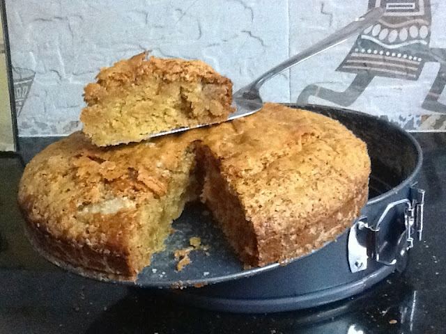 Pour the batter in the tin. It levels out on its own. Sprinkle the castor sugar on top for a nice crunch. I recommend this as it gives a lovely golden flakiness to the cake which is quite moist.