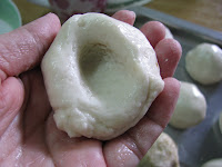 (4) press dough in the centre to make a hole, fill in peanuts mixture & sealed.