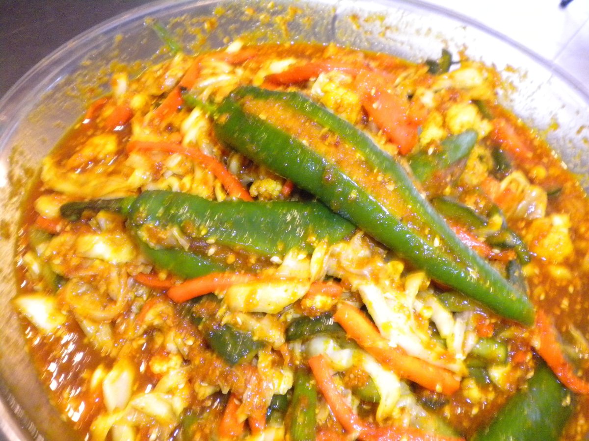 In a pot, heat the vinegar, salt and sugar (from vinegar dressing) until it boils, turn off the heat. Do not add all the sugar or salt yet. Add the rempah and mix the dressing. Add salt and sugar to taste. When cooled, add sesame seeds and ground peanuts. Add the vegetables and the green stuff chilies. Store in a jar and refrigerate. Serve as needed with vegetarian noodles.