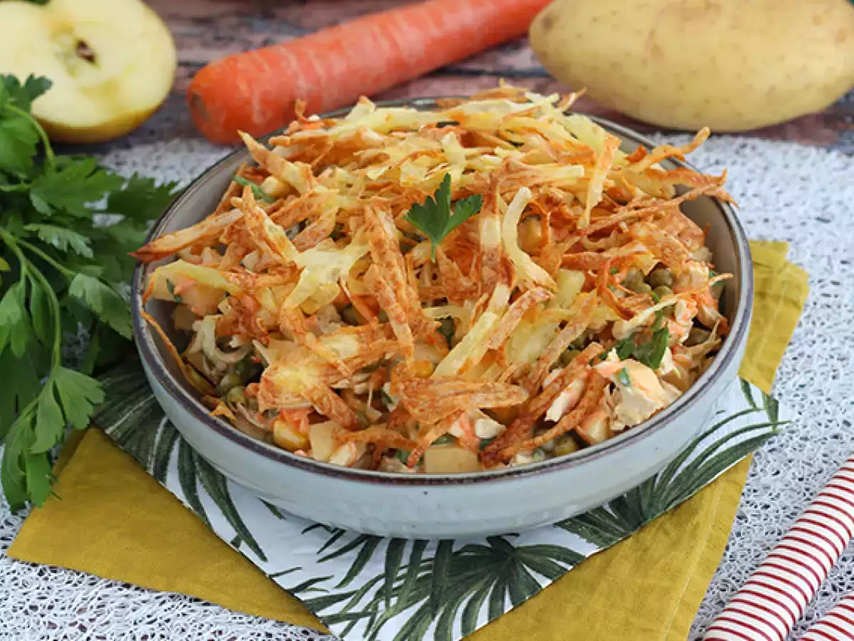 Come with us to Brazil and discover a new culinary specialty: Salpicão! A richly flavored salad that's easy to make at home. Fresh vegetables, spicy meat, apples for a touch of sweetness and a creamy sauce to spice things up. And for a crunchy touch, turn your potatoes into fine French fries. A great idea for a picnic, a lunch break at work or a barbecue with friends ;-)
